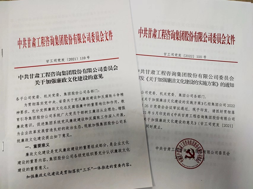 作為新組建的產(chǎn)業(yè)集團(tuán),甘肅工程咨詢集團(tuán)把資產(chǎn)整合、產(chǎn)業(yè)耦合和文化融合作為集團(tuán)公司組建的重要內(nèi)容,其中讓廉潔文化建設(shè)在企業(yè)文化建設(shè)中先行一步,早安排早部署,2021年9月集團(tuán)公司黨委研究印發(fā)《關(guān)于加強(qiáng)廉政文化建設(shè)的意見》,在中共中央辦公廳《關(guān)于加強(qiáng)新時(shí)代廉潔文化建設(shè)的意見》和省委《實(shí)施方案》印發(fā)后,又及時(shí)對(duì)標(biāo)、查缺補(bǔ)漏,2022年9月修訂印發(fā)《關(guān)于加強(qiáng)廉潔文化建設(shè)的實(shí)施方案》,為新時(shí)代集團(tuán)公司加強(qiáng)廉潔文化建設(shè)提供了指導(dǎo)。自組建以來,集團(tuán)公司廉潔文化建設(shè)力求在“內(nèi)化于心”上下功夫,在“外化于行”上求實(shí)效,引導(dǎo)干部職工廉潔從業(yè),廉潔用權(quán),積極營造“崇廉、尚廉、倡廉、守廉”的企業(yè)風(fēng)尚和發(fā)展氛圍。