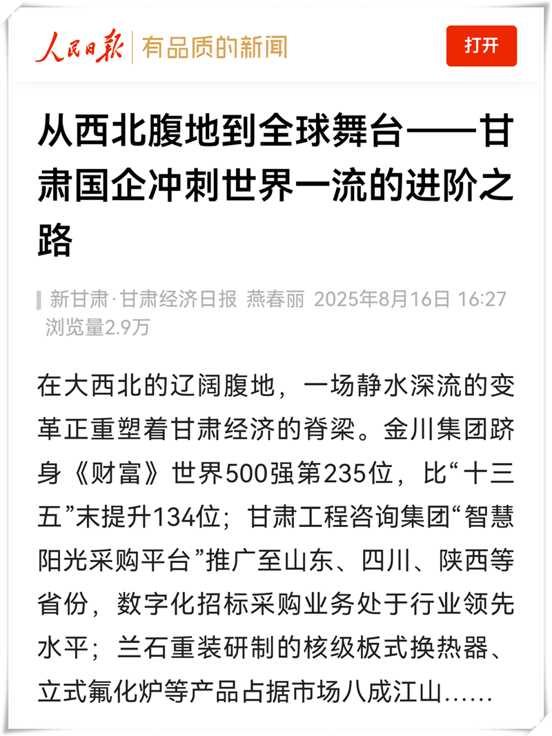 在大西北的遼闊腹地,一場靜水深流的變革正重塑著甘肅經(jīng)濟的脊梁。金川集團躋身《財富》世界500強第235位,比“十三五”末提升134位;甘肅工程咨詢集團“智慧陽光采購平臺”推廣至山東、四川、陜西等省份,數(shù)字化招標采購業(yè)務處于行業(yè)領先水平;蘭石重裝研制的核級板式換熱器、立式氟化爐等產品占據(jù)市場八成江山……