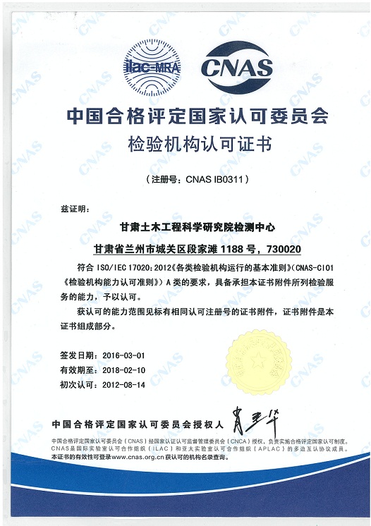 2012年2月首次依據(jù)CNAS-CL01建立了檢驗(yàn)機(jī)構(gòu)質(zhì)量管理體系,2012年8月初次通過國家檢驗(yàn)機(jī)構(gòu)認(rèn)可,檢驗(yàn)領(lǐng)域?yàn)榻ㄖ鼗?地基、樁基承載力試驗(yàn)與評價(jià))、建筑結(jié)構(gòu)(工程施工質(zhì)量評價(jià)、結(jié)構(gòu)設(shè)計(jì)復(fù)核、結(jié)構(gòu)抗震性能評價(jià)、結(jié)構(gòu)安全性與可靠性評價(jià))、建筑節(jié)能(圍護(hù)結(jié)構(gòu)節(jié)能性能施工質(zhì)量及評價(jià)、建筑物能耗及節(jié)能綜合指標(biāo)評價(jià))、混凝土(混凝土配合比質(zhì)量評定、混凝土質(zhì)量和生產(chǎn)過程質(zhì)量控制評定)。歷經(jīng)監(jiān)督檢查,換證復(fù)評審,持續(xù)有效運(yùn)行5年。