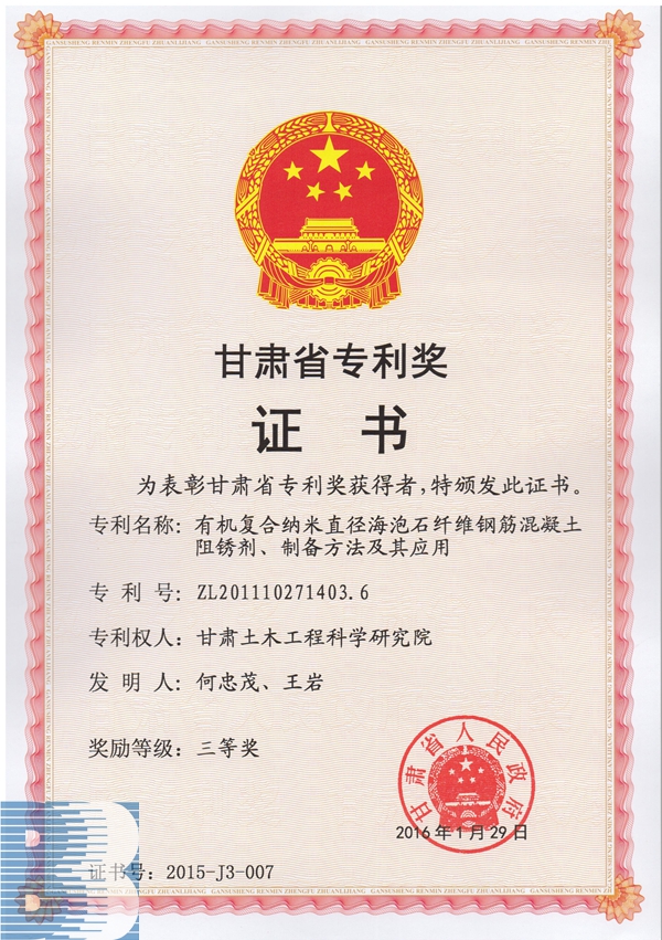 《有機(jī)復(fù)合納米直徑海泡石纖維鋼筋混凝土阻銹劑、制備方法及其應(yīng)用》(2015年度甘肅省專利獎三等獎)