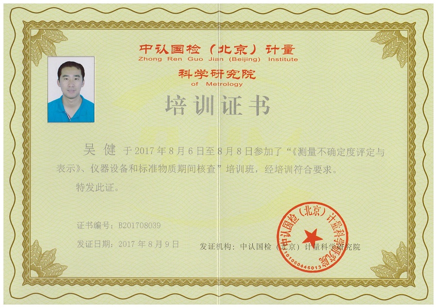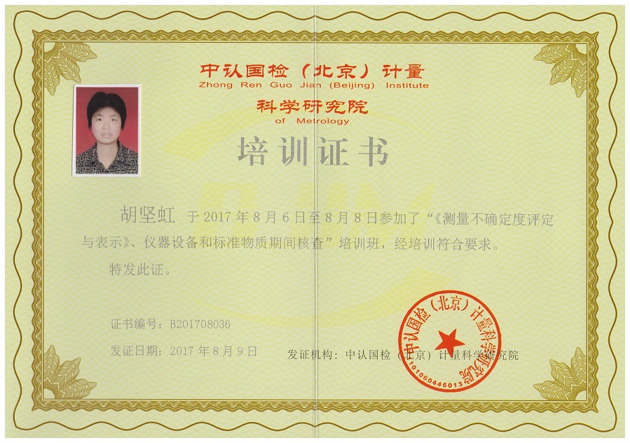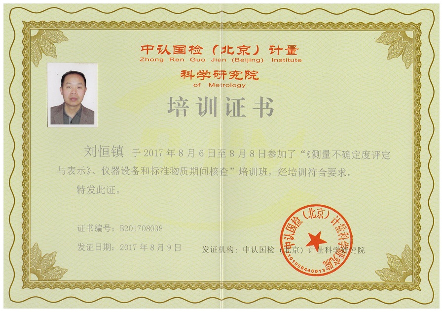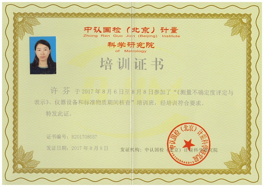 為了加強(qiáng)我院的測(cè)量不確定度及標(biāo)準(zhǔn)物質(zhì)期間核查的能力,我院選派了胡堅(jiān)虹、劉恒鎮(zhèn)、吳健、許芬四位技術(shù)人員參加了于2017年8月6日在廈門(mén)八山酒店開(kāi)展的“新版《測(cè)量不確定度評(píng)價(jià)與表示》、儀器設(shè)備和標(biāo)準(zhǔn)物質(zhì)期間核查”的培訓(xùn)學(xué)習(xí),培訓(xùn)為期三天,并獲得了由中認(rèn)國(guó)檢(北京)計(jì)量科學(xué)研究院頒發(fā)的培訓(xùn)證書(shū)。